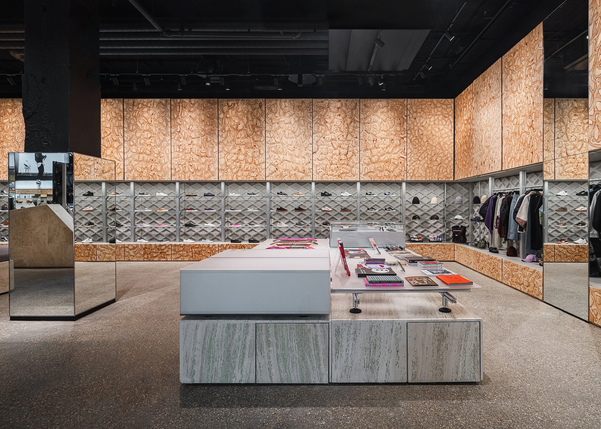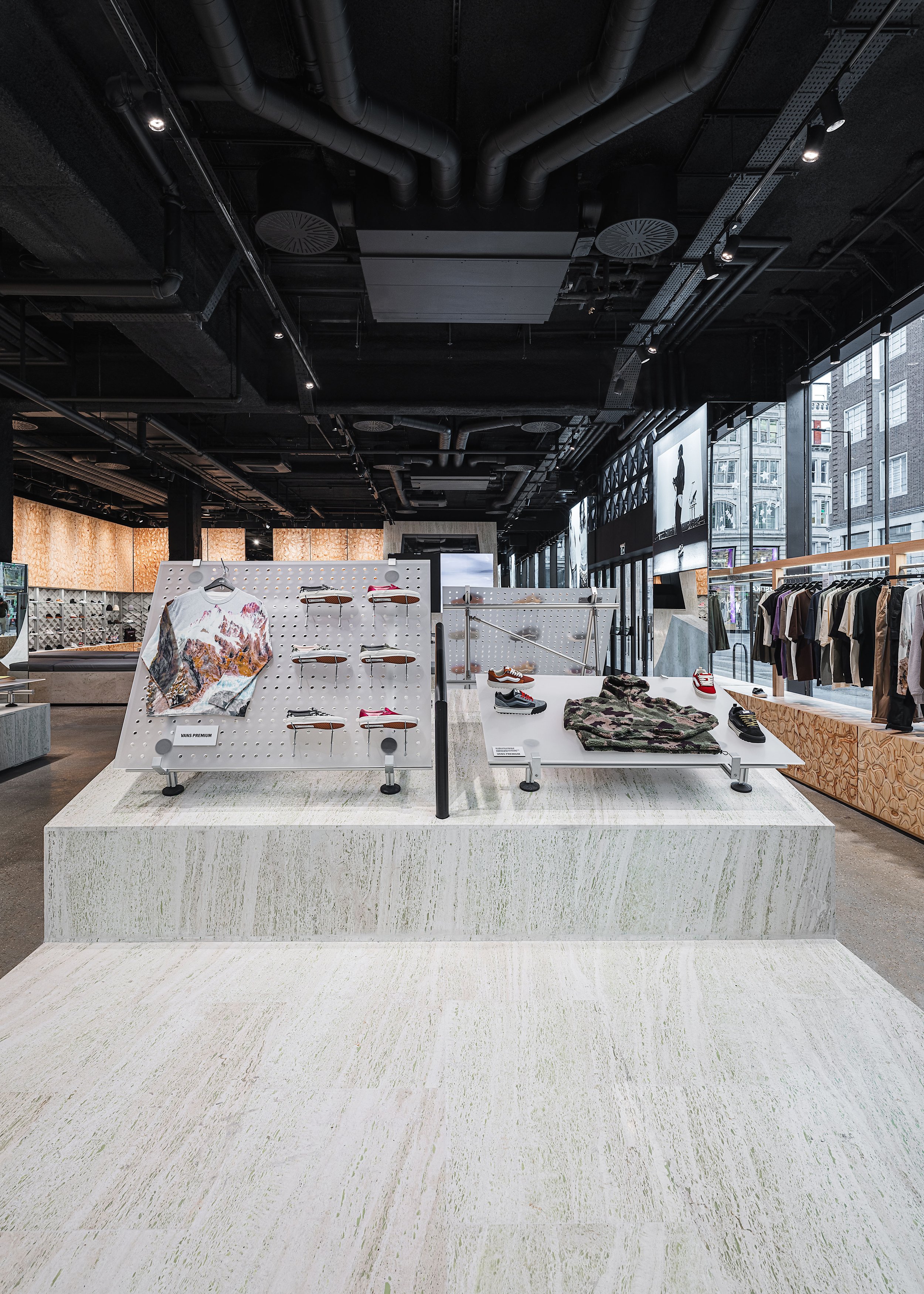 At its core lies a 200 square metre travertine skate ramp, developed in collaboration with Vans’ team of skate ambassadors. This centerpiece transforms the store into more than just a retail space; it becomes a playground for creativity, community, and self-expression. The environment reflects Vans’ spirit of authenticity, encouraging visitors to move, connect, and experience the brand not as an observer but as part of its living culture.